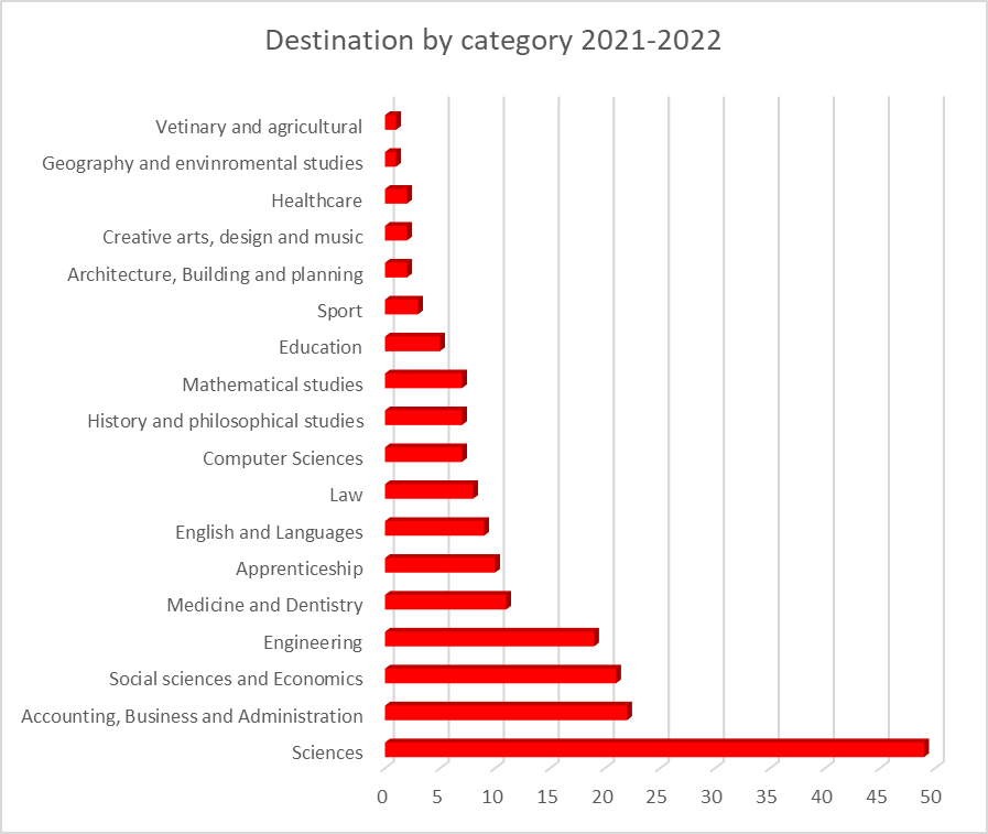 Our students went on to study over 85 different degree courses this autumn – ranging from accounting to veterinary medicine, with courses in between made up of the familiar (history, chemistry, geography) and the new (speech and language therapy, architecture, law ). Clearly, the class of 2022 are destined to go on and do amazing things.